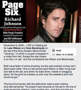 Okay, so the Wilson who's getting into fights with Kate Beckinsale on the set of Vacancy isn't a "blond funnyman with [a] distinctive nose," as the Post is reporting. But at least they got the photo right. Honestly, we wouldn't have been surprised to see Ann or Nancy Wilson of Heart fame up there. Unrelated: wouldn't a reality show featuring both sets of Wilson siblings being forced to live in a house together be an awesome idea? It would be called, like, "Butterscotch Barracuda" or "Try, Try, Try to Understand."