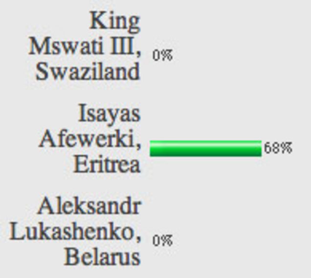 On the Choose-Your-Own-Dictator front, 68% of PARADErs still bizarrely favor Isayas Afewerki, president of Eritrea, as their choice of World's Nastiest Man. This, in a field of 20—including household names like Kim Jong Il and Vlad Putin—and with 43,482 votes cast! Yes indeed, we have much to learn yet about our mysterious weekend friends out there in America....
