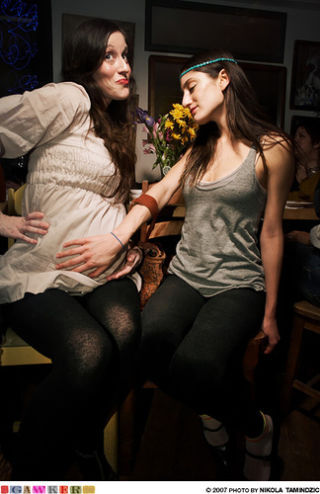 Last night, you watched the Oscars from your couch with a bucket of Cheez Things. Gawker editor Emily Gould and Gawker associate editor Doree Shafrir watched the Oscars at the Spotted Pig with people from reality TV and the bitchy queens of New York magazine, while Gawker photographer Nikola Tamindzic took lovely pix. Jealous much? Well, don't be: it was damn hard to see the show over all those people's heads. (Ooo, sort of a pun!) But Doree and Emily did make some fun new friends at the party, like ganja-toking socialite Arden Wohl (pictured above with a pregnant pal). And they even made it home in time to catch John Travolta's bizarre allusion to his queenliness. The first half of their epic postgame IM convo is after the jump.