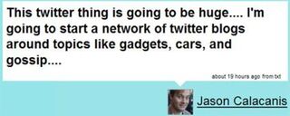 Social connectivity site Twitter has so far not reported to parents any cases of the service being used by K-12 students to request immediate sexual intercourse during school hours. There also appears to be no connection between Twitter users and attempts to stuff the ballot box for the Vlog Hot poll, since all the vloggers on Twitter are losing in their respective poll heats; most likely, this means that all those on Twitter who say they're voting for friends, are lying. The code word for tonight's Adaptive Path party has been confirmed as "tacotruck." Still unconfirmed is the possibility that "tacotruck" is also neighborhood slang for an extremely polluted form of crystal meth also known as "peanut butter," so party attendees should under no circumstances mention both for fear of confusing the vendor.