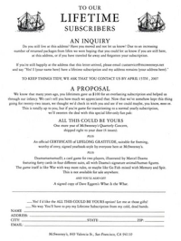 The offer at right (click to enlarge) recently went out to lifetime subscribers of Dave Eggers' whimsical quarterly McSweeney's. Written in that publication's oh-so-precious house style (which was funny seven years ago but now just makes you want to punch someone) the note starts off as a standard change of address form. But wait, there's more! They want to renege on that whole "lifetime subscriber" thing.