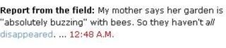 Remember how global warming skeptics would point out that there were still cold days in the spring? And then we all realized there was no global warming? Well, thanks to Slate blogger Mickey Kaus' mom, we don't have to worry about that disappearing bee epidemic either! Yay!