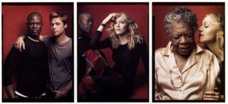 Ali joins Queen Rania of Jordan, Queen Rania is paired with Bono, Bono stares at the back of Condoleezza Rice's neck, Condi is almost edged out of the picture by George W. Bush, Bush observes Bishop Desmond Tutu at prayer, Tutu stands behind a seated Brad Pitt (you'd think the dude would have offered the elderly bishop the chair), Pitt bros it up with Djimon Hounsou, who scopes out Madonna's rack. Madonna whispers something in Maya Angelou's ear, Angelou looks disapprovingly at Chris Rock, Rock tweaks Warren Buffett's ear (Africa=ears, apparently), Warren puts a calm hand on Bill and Melinda Gates, the Gateses flank Oprah, who whispers something to George Clooney (seriously, there's some kind of ear fetish here, because Clooney does the same thing to Jay-Z). Hova stands next to Alicia Keys, Keys poses with Iman, and Iman whispers to Don Cheadle, who you'll remember from his earlier appearance with Barack Obama. Whew! Caring about another continent takes a lot out of you!