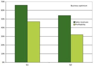 Only Valleywag could find a cloud in the silver lining of the latest survey of the business mood in Northern California in the second quarter. Substantial margins of local chief execs polled by Vistage, a group in which high-tech is most heavily represented, saw their sales and profitability on an upward trend. But company bosses are a little less bullish than they were three months ago. For instance, 52% saw profitability improving, compared with 20% who expected a decline: a margin of 32%. In the first quarter, that margin was 47%. In confidence surveys like this one, it's the trends that matter. And the trend in Bay Area business confidence is down.