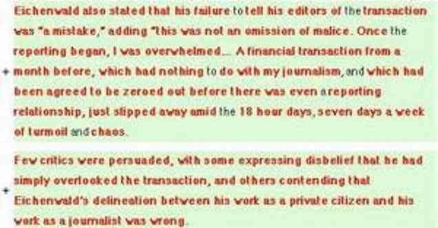 You know who suddenly has the longest Wikipedia biography in history? Not just Times tech columnist David Pogue, but also former New York Times reporter and current (alleged) Portfolio scribe Kurt Eichenwald! An unknown Wikipedia user called Milo73 has added huge amounts of autobiographical data recently. Maybe this person even knows Kurt, because Milo73's IP address tracks to Dallas, Texas, which is where Kurt lives! (Also, that IP address worked on the Wiki page of Eichenwald story subject Justin Berry too—but on no other entries.) The Wiki writer knows all kinds of obscure stuff about Kurt, about his epilepsy, for instance. You know what else is interesting? The Wikipedia additions cite court transcripts in State of Michigan versus Kenneth Gourlay, a kiddie porn case in which Eichenwald testified. Almost nobody has those transcripts, because they cost nearly $2000—we were trying to get them for a while, but gave up. A few folks, including Kurt and his Dallas lawyer Tim Perkins, have copies though!