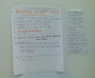 The mousetraps in the cafeteria notwithstanding, according to this list (which, we understand, lives on the third floor of the new New York Times building, just a hop and a skip away from several masthead editors' offices), the last mouse sighting in the building was on August 7. Or maybe that's just the last time someone bothered to write it up on this sheet. (The note on the right says, "Let's keep this list going!")