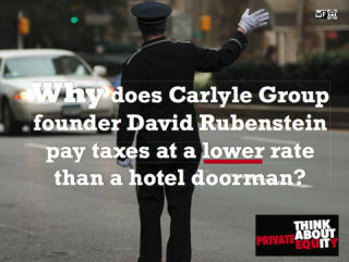 "David Rubenstein made $260 million last year, yet he paid taxes at a lower rate than the doorman at this hotel. Not only that, companies like Carlyle don't pay their fair share in corporate taxes." said Pat Boone, President of NY ACORN.