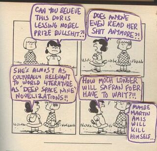So the womyn of Jezebel and our new cougar pal Erica Jong were very thrilled that feminist author Doris Lessing got the Nobel Prize for literature, but we were sort of less than thrilled and felt like the choice reeked of affirmative action girl style now. (We think Doris felt much the same!) Seriously, ladies (and mens!): have you read 'The Golden Notebook'? Really? While awake?
