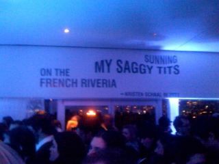 Last night Radar magazine had a party at the New Museum to celebrate "the most exciting rogues, renegades, and rule breakers of the year," a list that included facially scary but totally funny comedienne Kathy Griffin, 'The Squid And The Whale' teenfeelings-proxy Jesse Eisenberg, and something called "Spankrock." We didn't notice any of these people (institutions?) in attendance last night, but then, the party was on the ground floor and seventh floors of the New Museum and we fled the college-aged crowd on the first floor as soon as an opportunity presented itself in order to spend time on the seventh floor talking to the same 10 people we always talk to. The view from up there is almost pretty enough to convince you that it makes sense to build misshapen towers all over the Lower East Side. Anyway, Radar had decorated the walls with quotes from their various rogues and renegades and they spelled Riviera wrong. But hey, nobody's perfect.