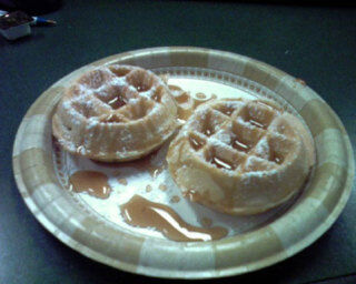 The hedge-funders at Advent Capital Management are wrapping up their holiday party lunch right now! It is totally catered by Harlem Wing and Waffle! Here is a picture of the actual waffles! I am totally hungry! They have two waffle stations and one chicken station with jerk and teriyaki both! They are so winning the holiday party contest.