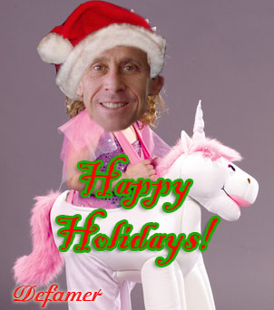 As some readers complained that last year's holiday greeting caused their usual Christmas bedtime visions of dancing sugar-plums to be replaced by nightmares starring a certain mysteriously infantilized—if still festively attired—superproducer, we've decided to soften this year's offering a bit. Who could possibly be troubled by the delightful image of Santa Grazer atop a plush unicorn? Not us, at least. Please accept our warmest wishes and heartfelt thanks for helping us survive another 12 months of largely the same nonsense we all lived through the previous year. We'll be back on Monday for a half-day, off Tuesday for the holiday, then back to a more-or-less regular schedule Wednesday for the always action-packed week before the New Year. (Or, more accurately, Seth will be here—he always puts a vacation until January 2nd under my Christmas tree. And all I got him for a late Hanukkah present was a regifted set of "I Am Legend/I'm With Legend" t-shirts Warner Bros. sent in!) See you in 2008! —Mark