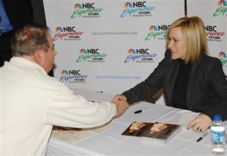 [Patricia Arquette, star of the NBC drama 'Medium', greats a fan at the NBC Experience store today, New York City; image via AP]