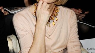 [The icy Vogue editor was photographed at the Badgley Mischka show for New York's Fashion Week today; image via INF]
