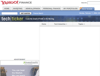 In a repeat of last week's failed launch of lifecasting service Yahoo Live, Yahoo's new online finance show Tech Ticker has launched with a broken page. If the millions of users exposed to it could see it — the show is prominently placed throughout the site — they'd learn that it is hosted by BusinessWeek's Sarah Lacy and TheStreet.com veteran Aaron Task, with contributions from the likes of Paul Kedrosky and Silicon Alley Insider's Henry Blodget (interviewed in one of the first episodes). After being down for more than 20 minutes, Tech Ticker seems to be back up ... sort of. The interview with Blodget is viewable on the Tech Ticker website but now the embed code seems to be broken. How much money is this company worth again? If they find an engineer to fix it, here's the clip: