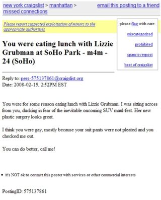 That would be (convicted! attempted!) killer and celebrity uber-flack (and possible voter) Lizzie Grubman, whose companion just may get lucky if this Missed Connection finds its way to him. We'll do everything we can, even after the tyranny of Valentine's Day. [Craigslist]