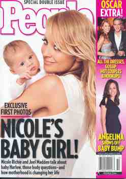 Attached, Nicole Richie's million dollar baby. As in one-million dollars, the price paid by People for the exclusive. Holy buckets, you say—what an expensive baby! You, sir, are naive. This is the bargain baby! Shiloh Jolie-Pitt was worth $4m. Jennifer Lopez's new twins went for more than $3m each! (How awesome would it have been, actually, if Jennifer had sold one twin to People and the other to OK!?) Even Christina Aguilera's loser baby was worth $1.5! And once Angelina has this next phantom baby the photo will probably cost some outlet enough to publicly finance the presidential election. Or like ten minutes of Iraq! This is the business model that will save the magazine industry. And keep our celebrities the way we like them: pregnant and complicit in the exploitation of their families. [Related]