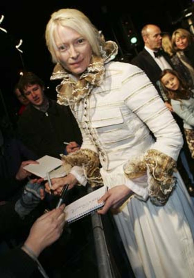 When asked about her night of partying after her Oscar win, specifically at Prince's house party, British English-born, Scottish-living actress Tilda Swinton said "Steve Wonder sang 'Superstition,' for God's sake. It was absolutely fantastic." There's a certain tone there, one of a "well, duh!" familiarity that makes us think we might want to be friends with her. She's funny, smart, a bit bizarre, and she's amorously adventurous. It's fun to think that she can be like this, out-there but also grounded, especially after her scary, brilliant turn in Michael Clayton.