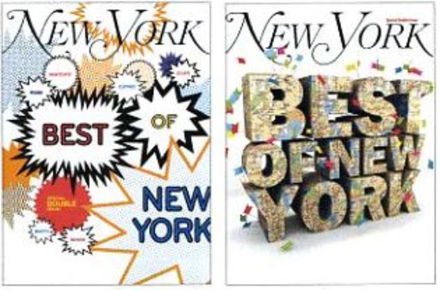 Every time I get down about skyrocketing rent and service changes to the F train, I turn to New York magazine. It just reminds me that I live in the greatest city of all time, ever, and if I ever moved to a place with fresh air, I would die from lack of exposure to fusion cuisine. This week, it's The Best of The Greatest City of All Time, Ever, Issue. To ensure that New York magazine could fully illustrate just how great New York City is, the magazine commissioned designs for 25 covers. And then, because the spirit of New York and New York lies in wasteful, reckless spending, they only used two. I got the one on the right, but I'm thinking about going out to newsstands to buy the other one for commemorative purposes. That's just how awesome New York is. [Folio]