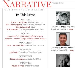 Writerly power-couple Tom Jenks (former fiction editor at Esquire, GQ and Scribner's), and novelist Carol Edgarian (Rise of the Euphrates), are profiled by the SF Chronicle about their literary-online magazine, Narrative. It has "selections from writer friends such as Jane Smiley, Tobias Wolff and Joyce Carol Oates;" its goal is "to connect more readers to more literary writers." It is literally subtitled "The Future of Reading." (The future of reading still involves Joyce Carol Oates and the Internet?) Sixty-five people volunteer for Narrative without pay, including big shots like Michael Wiegers of Copper Canyon press, a poetry publisher. So why exactly is the future of literary writing online?