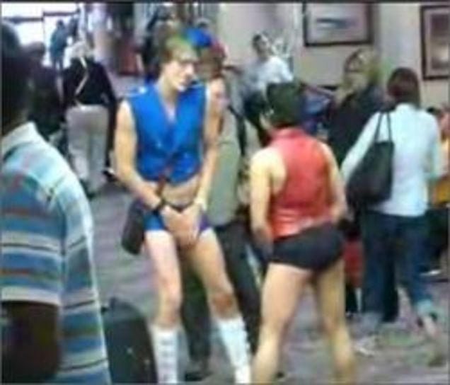 Sacha "Borat" Baron "Ali G" Cohen is working on his upcoming flick about his character "Bruno," the supergay Austrian fashion reporter. Since everyone on both coasts (except for Ben Affleck) is obviously too familiar with his work to be punked, Bruno has traveled to the heart of flyover land, Wichita, Kansas. Where he was captured on film doing supergay stuff! His act reportedly "almost looked like pornography," at least to Kansas sensibilities. After the jump, video [via Towleroad] of Bruno and his funky pants dance, which brings joy to the dreary confines of the Wichita terminal.