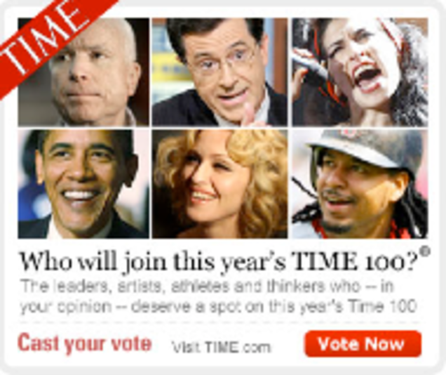 I'd guess there are a good dozen other communities with several million members that could push a star into the top ten. Of course our own weak attempt to get votes for Gawker publisher Nick Denton didn't do much, because Gawker isn't a cult of personality. But a community like 4chan or a dedicated group of top YouTube users could pick a candidate. And it sounds so dorky to say this, but that kind of shows who's really influential: you. And by "you" I mean losers in Internet forums with no larger life goal.