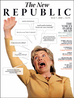 This is the cover of the new New Republic. It's attached to a kinda interesting story about infighting in the Hillary Clinton campaign and how head pollster Mark Penn is a dick who is impossible to work with. But the real debate is over just how sexist this cover is. Your editor is a dude, and is therefore not always sensitive to these things. But still. Unflattering photo = sexist? Or is it the term "psychodrama"? It is unfair, yes, and mean-spirited, obviously, but... it's the New Republic. They printed the fucking Bell Curve idiots. Ok: the cover makes her look shrill and crazy, but isn't it a callback to noted shrill and crazy penis-haver Howard Dean? And aren't there similarly offensive "psychodrama" stories printed about President Bush and his daddy issues every damn month? Hell, we'll give this a 4. Now: debate! But for the love of Paglia be intelligent about it, please. We'll be watching, with an itchy banning finger. [TNR, Feministe, Jezebel]