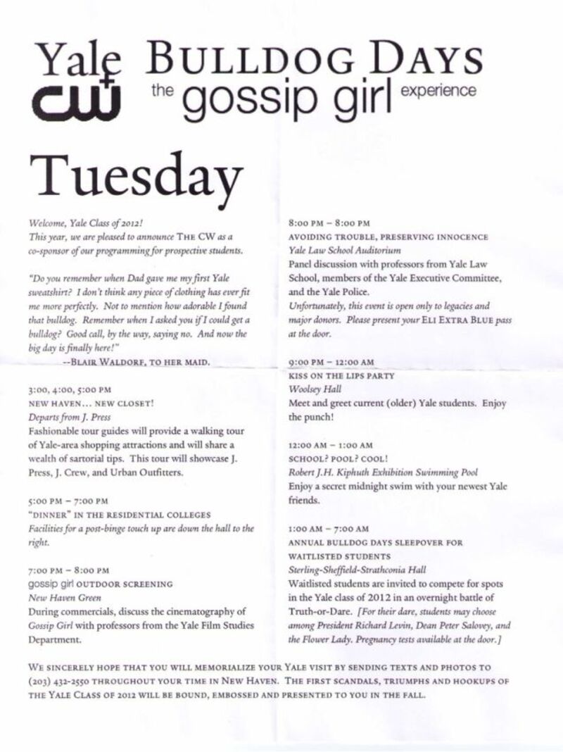 Haha! So, um, I got a little jump-the-gun self-righteous there and didn't quite read the fine print! This wasn't really a Gossip Girl experience day for admitted Yale students. It is clearly a fake, but a hilarious and (for like two seconds or two minutes if you're an idiot like me) slightly believable one. Anyway, please enjoy without any of my ridiculous social theorizing. Click through for larger.