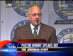 Reverend Jeremiah Wright, Barack Obama's controversial former preacher, spent the weekend on media blitz, and the end result is that the press doesn't really like him. Except where before they were just harping on him because it was a great, easy story, now it's personal, because Wright expressed deep disdain for the entire journalistic class during each of last weekend's appearances. NOT DONE, REVEREND. You're supposed to be all penitent and you're expected to curtsy to whichever 60 Minutes dinosaur they unfreeze to drag out your meek apology. But Errol Louis in the Daily News—alarmed though he is that Wright acted at the Press Club "as if nobody in the room was learned enough to ask him a question"—did discover that Wright was actually invited to the Press Club by an enthusiastic Hillary Clinton supporter. Barbara Reynolds voted for Clinton in Maryland, criticizes Obama on her blog, and "organized" the Wright event at the Press Club. Hah. Well, if Obama's "scary" black preacher actually dooms his candidacy, we'll happily join the "god damn America" bandwagon, but that will probably surprise no one. After the jump, the Daily Show's bit on Wright's weekend performance. Stewart's "I'm scared of the black man" routine gets less funny every time he employs it but the clips are decidedly enjoyable.