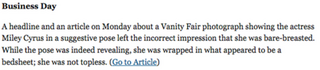 A headline and an article on Monday about a Vanity Fair photograph showing the actress Miley Cyrus in a suggestive pose left the incorrect impression that she was bare-breasted. While the pose was indeed revealing, she was wrapped in what appeared to be a bedsheet; she was not topless.