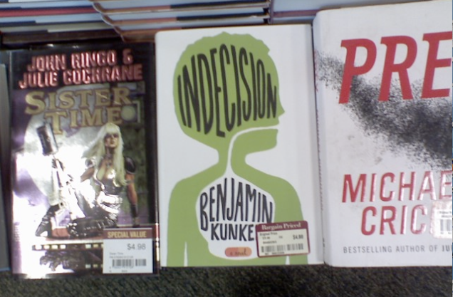 Sometimes, the future is right in front of your face. Three years ago, there was a different n+1 (the most important literary journal of our time) dude publishing a much-vaunted, yet sorely disappointing first novel featuring immature young men fumbling their way with tragically smart women who are only with them due to the startling lack of suitable males in New York. It was Benjamin Kunkel's Indecision. This weekend, a reader snapped a photo of it at Barnes and Noble in Hyannis, Massachusetts, on fire-sale at the "Under $5" table... next to Michael Crichton. (Click to enlarge.)