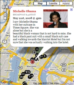 Note to America: Michelle Obama is not in New York. Whoever sent in yesterday's Michelle Obama sighting to Gawker Stalker was incorrect. She was not in New York and "she has Secret service now so she does not enter through front doors," according to one emailer. Elitist. Anyway, Michelle's communications director wrote in last night to ask us to pull that sighting down, "as it is creating GREAT confusion." The truth is we are not sure how the map works and are unable to pull anything down from it. But we are still sorry about confusion. Shame on you, anonymous Gawker Stalker who submitted the sighting. By which we mean, obviously, Maureen Dowd.