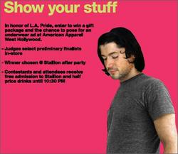 You'll be kicking yourself for missing this party in an LA American Apparel store last Friday. It was not just an event in honor of gay pride; it included a contest to "win" a chance to "Show Your Stuff" in an American Apparel ad. "Winner chosen @ Stallion after party." Isn't that how it always turns out? Dov Charney continues to find new and innovative ways to trick dudes and girls alike into helping him skeeve out the world. The full flier, with NSFW lime green underwear shot, after the jump.