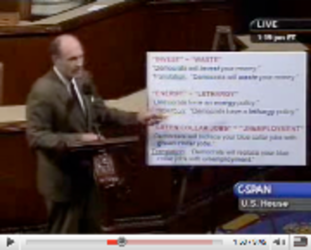 Thaddeus McCotter (R-Michigan) spent his time on the floor of the House of Representatives yesterday giving a little presentation called "How to Speak Democrat." For example, "progressive" means "regressive"! So witty! And the presentation (shown below) should in no way be seen as the sole thing McCotter has accomplished with his time while he only raised $8,500 of the nearly $1 million he's supposed to raise for the National Republican Congressional Committee.