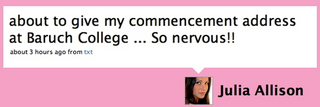 Presented Without CommentSheila6/26/08 5:31pmFiled to: fameballsjulia allison89EditPromoteDismissUndismissHideShare to KinjaToggle Conversation toolsGo to permalink Julia Allison, dating columnist/commencement speaker. [via Alex Balk]Reply89 repliesLeave a reply