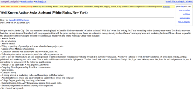 This Craigslist-ad placer and "bestselling" author has been on the Tyra Banks Show, is willing to pay you $12 an hour (after you pay your own taxes), and just in case you didn't know what an assistant to a "well known author" does: "Did you see Sex in the City? Did you remember the role played by Jennifer Hudson where she's Carrie's assistant? Well, that's what I'm looking for." Oh, and don't reply if you are too good for "occasional light housework." (Even Louise from St. Louis organized Carrie Bradshaw's apartment!) Um, what else?