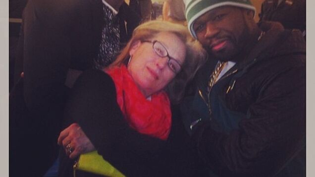 [50 Cent caught up with Meryl Streep and Kobe Bryant after the Knicks-Lakers game on Sunday. Said the rapper, "Things got a little gangsta." Image via @50cent/Instagram.]