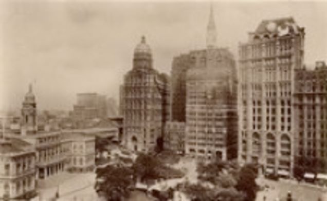Manhattan's famous Park Row, once home to (l-r) Joseph Pulitzer's World, as well as the Tribune, the Press, the Times, and the New York Sun, is no more. The reincarnated Sun attempted to house itself in the paper's original Newspaper Row building without luck-not enough T1 lines or something-and had to settle for a spot down the street.