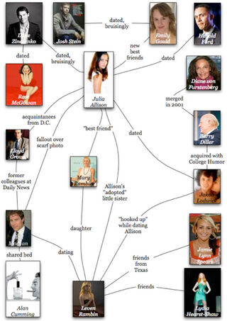 Who needs Gossip Girl? Manhattan's real-life dramas are so much more intricate, petty, and intertwined. Publicity whore Julia used to date Jake, Barry's former toyboy, who was bipolar, which might explain why he dated jailbait Leven, who was friends with Britney's younger sister, who's pregnant. Leven now sees Hud, though he once shared a bed with perfume promoter Alan, who's married (to a man!); Hud looks increasingly like his former boss, Lloyd, who introduced him to Julia when the dating columnist and TV commentator moved to New York. Bad move: Julia published a photo of him in a red scarf, looking Lloyd-like, and now Hud's pissed: he yelled at her at the Beatrice, even though pretty-boy Fabian and Chloë were there. (Wasn't she in some movies?) Sooo embarrassing. But not as embarrassing as Julia totally stealing Chloë's red dress (not nearly as nice as the ones designed by Barry's beard, Diane) for Valentine's Day. Or when Emily, Julia's new best friend, hinted that Josh was a premature ejaculator; he certainly got revenge. CLICK FOR CHART »
