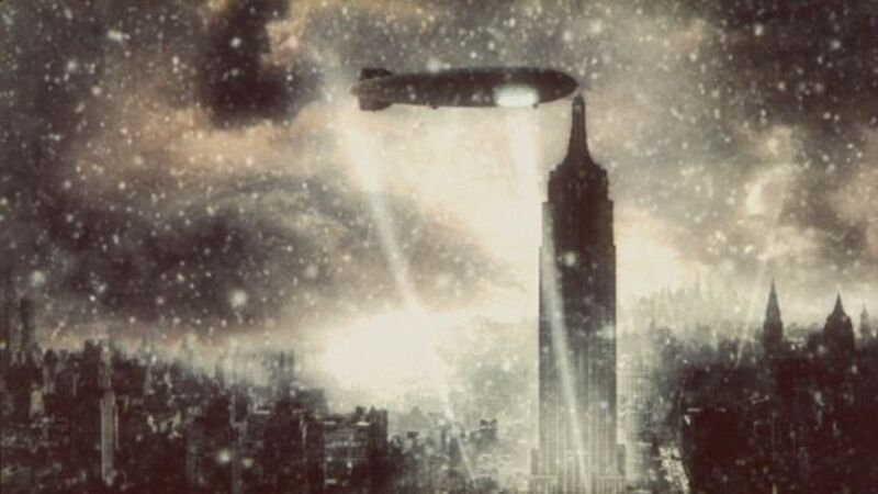 Last in this week's series of gloomy New York panoramas, this image is a still from Sky Captain And The World Of Tomorrow, a movie remarkable (only) for its painstaking special effects. The spire of Empire State Building, now festooned with communications antennae, was originally designed with a docking port for dirigibles, a fantastic conceit only realized in Sky Captain's alternate New York.