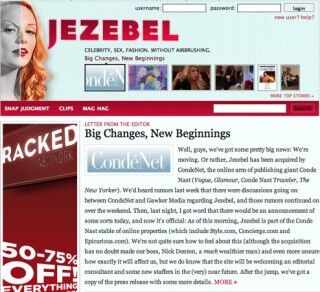 One plea. Jezebel's popularity derives from its willingness-eagerness-to break with the generic blandness of women's magazines and websites. Jezebel is anything but bland. In the effort to sell more advertising on the site, I hope that Conde Nast doesn't chill the vitality of Moe and Tracie and Jezebel's other writer-provocateurs.
