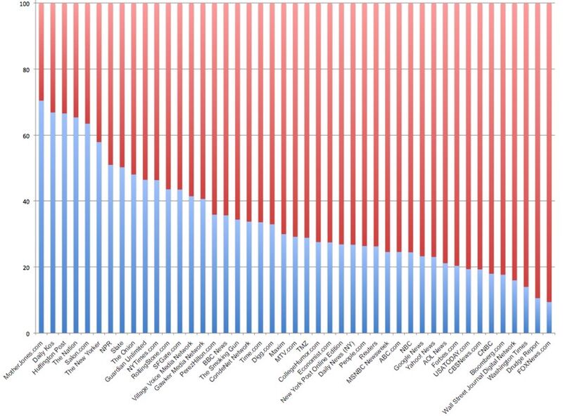 Nielsen, one of the outfits which tracks where web users spend time online, also asks survey respondents a series of questions about themselves-including, interestingly, their political leanings. So which sites are the most liberal, and conservative? The blue bars represent the proportion of the site's audience who declare themselves to be liberal or very liberal; the red bars represent conservative, moderate and undeclared. Daily Kos and Huffington Post, unsurprisingly, attract an overwhelmingly left-wing audience. Fox News and the Drudge Report draw the highest percentage of conservatives-even though Rupert Murdoch's news network still declares itself "fair and balanced."