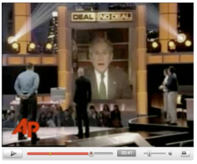 If you were wondering why everyone running for president was talking like a wrestler yesterday instead of retaining some semblance of dignity, you'll be happy to find out the candidates were merely practicing for a new presidential tradition begun by George W. Bush: Appearing on a TV game show and cracking jokes. That might sound a little cheesy, but it was for a good cause. The president, you see, wanted to honor an Iraq veteran with the sort of dignity only host Howie Mandel can conjure on Deal Or No Deal. "Are you ready to get some acknowledgement for your hard work and bravery?" Mandel asked. Oh, sure, what the hell: