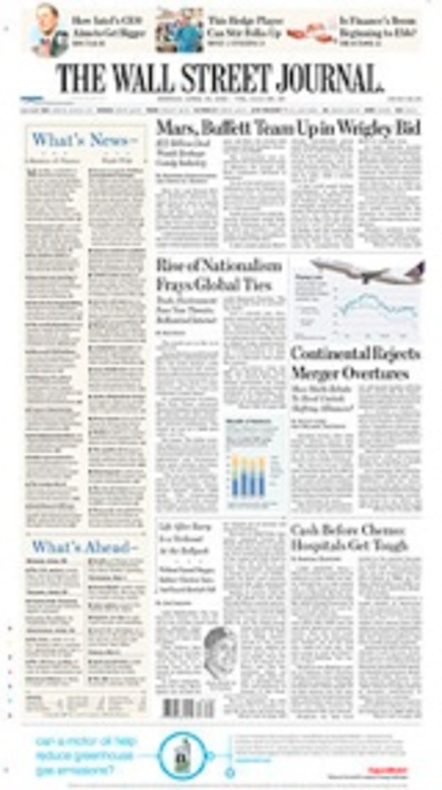 "Top American newspapers posted further declines in weekday circulation in the six-month period ended in March, with the exception of USA Today and The Wall Street Journal... The New York Times was No. 3 at 1,077,256, but that was down 3.9 percent from the period a year earlier... Newspaper circulation has been on a declining trend since the 1980s, but the pace of decline has picked up in recent years as more people go to the Internet for news, information and entertainment." [Times]