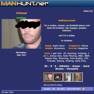 Our hard-partying reporter has no trouble finding bedmates among his media colleagues, but he plays fratboy when trawling for one-night stands on the notorious Manhunt. "I'm a writer, runner, ex-football player and Zeta Psi brother, bar-hopper, people-watcher-and I'm a blast," he writes. There's nothing that shocking in the profile: he lists the usual menu of kinky gay sex; and he's not the only person to have been caught out with an online ad. Here's the mystery: this journalist is on the biggest and most sensitive story of his career, and he's been rooting around in other people's personal lives. How on earth does he have time to trawl gay hookup sites? And why would he leave so many clues as to his real identity when he's so much in the public eye?