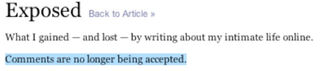 Times editors are apparently tired of people saying mean things about Emily Gould and about their own decision to publish her meditation on blogging, because they've shut down the comments section attached to Gould's magazine piece. Some 727 responses flooded in before the shutdown, even though the article won't be physically published until the Sunday issue. Many called the former Gawker editor narcissistic, self-indulgent and a bad writer and said her story was a waste of space; there were supporters, including people who praised Gould for having moved on from vicious, inconsequential Gawker and for pushing them to reexamine their own online personas. Whatever was said, the decision to shut down comments is bizarre, because just yesterday Times Magazine editor Gerry Marzorati told FishbowlNY the story was worthy of his cover precisely because of the discussion it would spark: