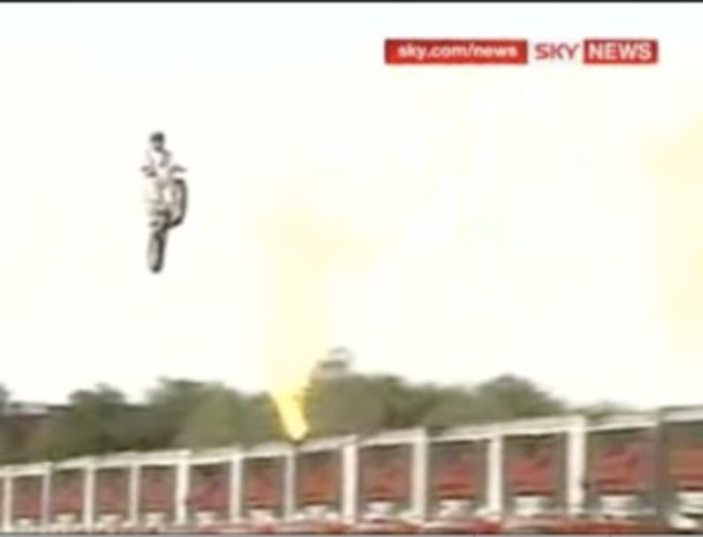 It's not an American summer holiday weekend if some crazy bastard doesn't pull off a life-threatening stunt. So, last night at an Ohio amusement park, Robbie "Son of Evel" Knievel jumped his motorcycle 200 feet through the air, hopping 24 delivery trucks and breaking his dad's 1975 record of 14 trucks in the process. Video of the jump, after the jump.