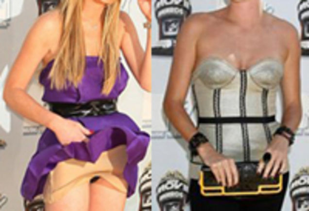 What is it about MTV awards ceremonies that brings out so many female celebrities' inner hooker? Normally demurely dressed stars like good girl Anne Hathaway and Charlize Theron both showed up on the red carpet looking like a dominatrix-for-hire and a Heidi Fleiss escort circa 1990, respectively. Megan Fox stepped outside her rep as being a poor girl's Angelina Jolie by attempting to dress like a cupcake, but the frilly underskirt just said Little Pink Ride Your Hood, and The Hills resident scandalista Audrina Patridge donned a skin-tight, midnight blue satin one-strap number paired with ironed black hair that looked eerily like what we suspect Marilyn Manson wears in drag. So why pick last night to debut their diaper-length hemlines and S&M costumes? Look no further than a closer peek of Lindsay Lohan's totally unintentional panty-flash for answers, and the rest of these ladies of the night after the jump: