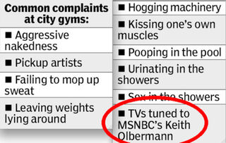 The Post's efforts to slam Keith Olbermann are getting increasingly desperate. In its latest attempt to lash the MSNBC personality on behalf of owner Rupert Murdoch and News Corp. comrade-in-arms Bill O'Reilly, who are in a feud with the Countdown host, the tabloid somehow managed to work an Olbermann dig into a story about bad gym behavior. Well, actually, not into the copy of the story itself, but into the accompanying infographic, pictured above. It's an awkward enough dig to make one miss Olbermann's Rupert-Murdoch-as-a-pirate imitation. [Post]