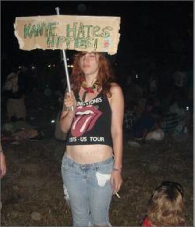 Kanye West was scheduled to play at the hippie-infested Bonnaroo music festival in Tennessee last weekend at 8:15 p.m. Then he pushed it back to 2:45 a.m. to better take advantage of his fresh-ass neon stage set. Then he didn't show up until 4:30 a.m. This angered the assembled hippies, who took to booing, scrawling anti-Kanye graffiti, and waving signs protesting his insensitivity for hippie time management. One, he's a jerk. Two, why would anyone stay up all night waiting to see a Kanye West show? Three, every hip hop show starts two hours late. Get used to it, hippies. [via Animal NY]