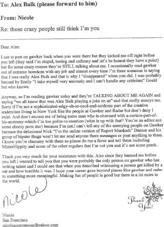 Former Gawker commenter Newtojezebel has been banned for nine months now, which is probably some sort of record, but apparently people continue talking about her, all the time. She was banned for seeming a little unstable, so naturally she decided to contact former Gawker editor Alex Balk, via fax for some reason, to ask him to please email all of you to explain that she is not him. Balk, of course, is too busy writing on issues of great international import at Radar to do this on his own, so we've decided to help. You follow? Just read it!